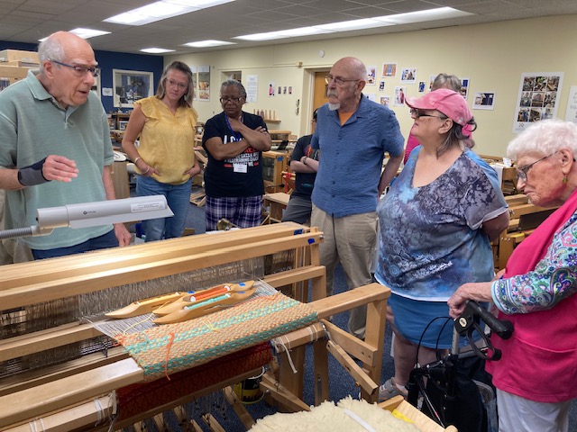Artisan Joanna is standing next to her loom, wrapped in her completed warp. This fabric will be finished into scarves. Hartford Artisans Weaving CenterArtisan Lou speaks to a group of volunteers and artisans during a quarterly "loom tour" in our studios. Each quarter artisans and volunteers tour the studios with our staff to see, touch and talk about current weaving projects. Hartford Artisans Weaving CenterArtisan Rui is weaving on our community loom in the Main studio. Hartford Artisans Weaving CenterArtisan Valerie is weaving at her loom in our Main studio. Hartford Artisans Weaving Center
